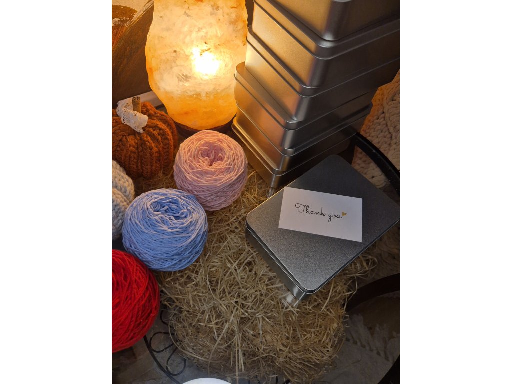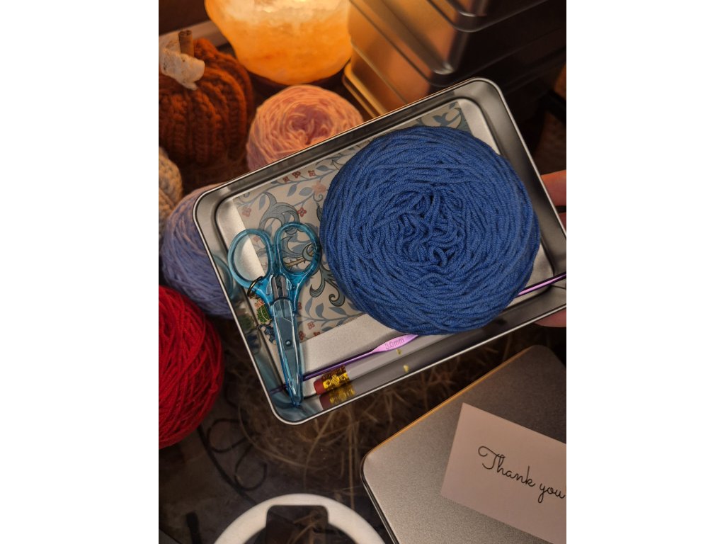 To vše v praktické kovové krabičce (15 x 11 x 4 cm), kterou můžeš znovu a znovu využívat - na háčkovací drobnosti, nebo třeba jako dárek pro tvořivou kamarádku.